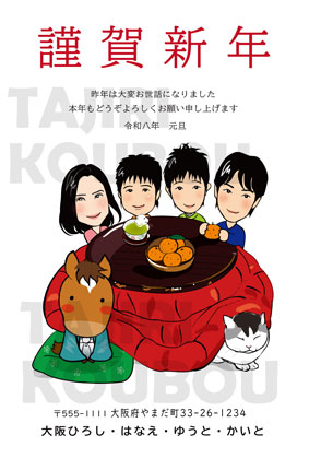 こたつと馬と猫のイラストのほっこり似顔絵年賀状です