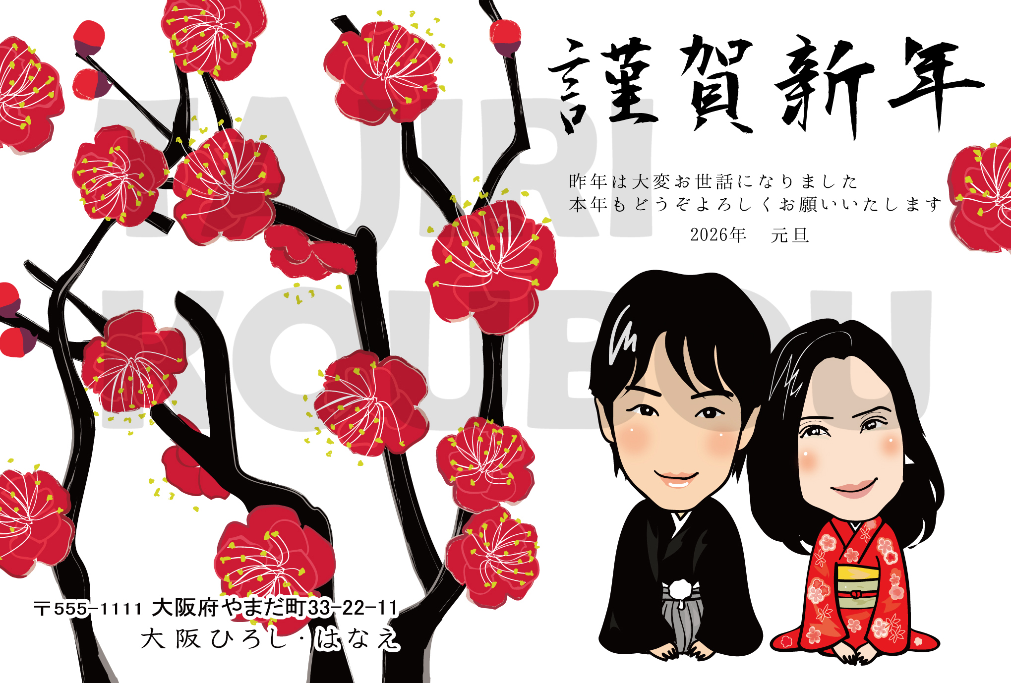 和風でかわいい梅のイラストの似顔絵年賀状。結婚報告にも^^