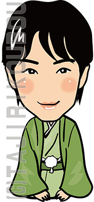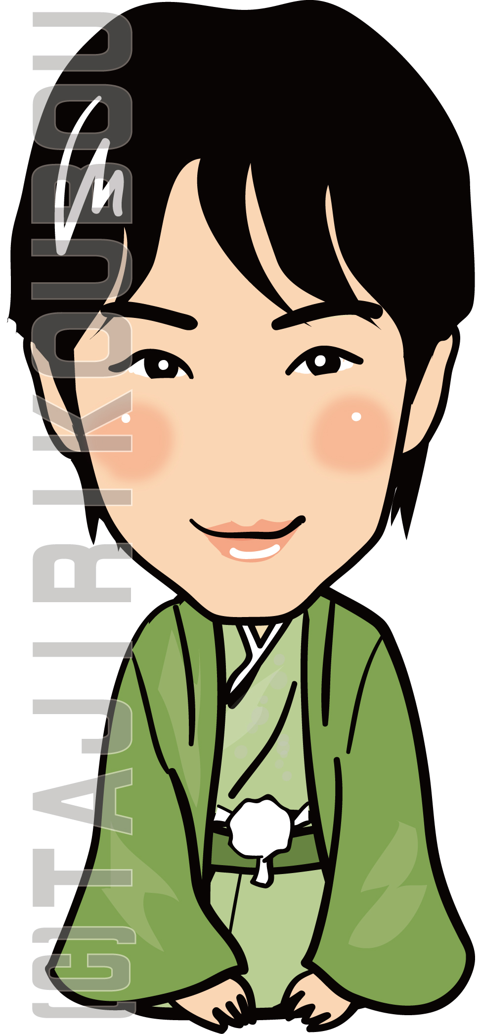 黄緑色の着物で正座をしている似顔絵イラストです。