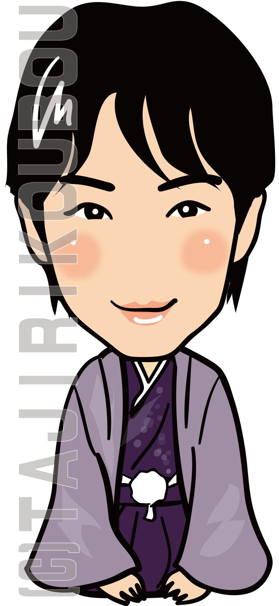 紫色の着物で正座をしている似顔絵イラスト。