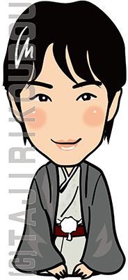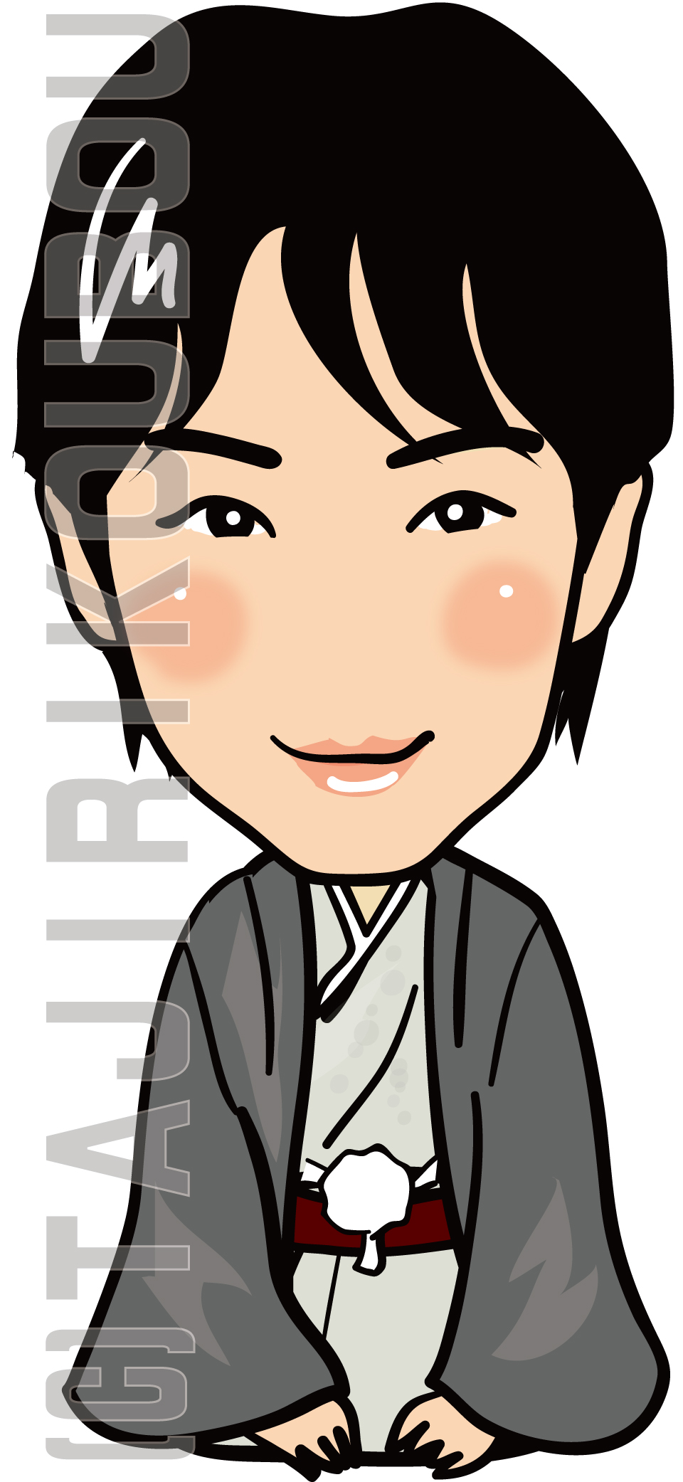 落ち着いたグレーの着物で正座をする似顔絵イラストです。